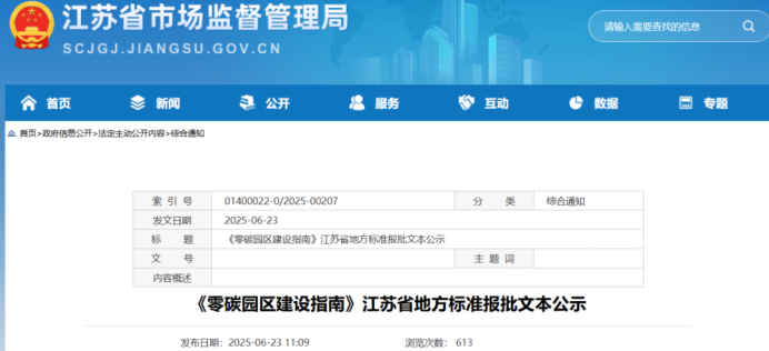 2025年6月23日,江苏省市场监督管理局拟批准发布《零碳园区建设指南》江苏省地方标准报批文本公示,公示期为2025年6月23日至2025年7月22日。